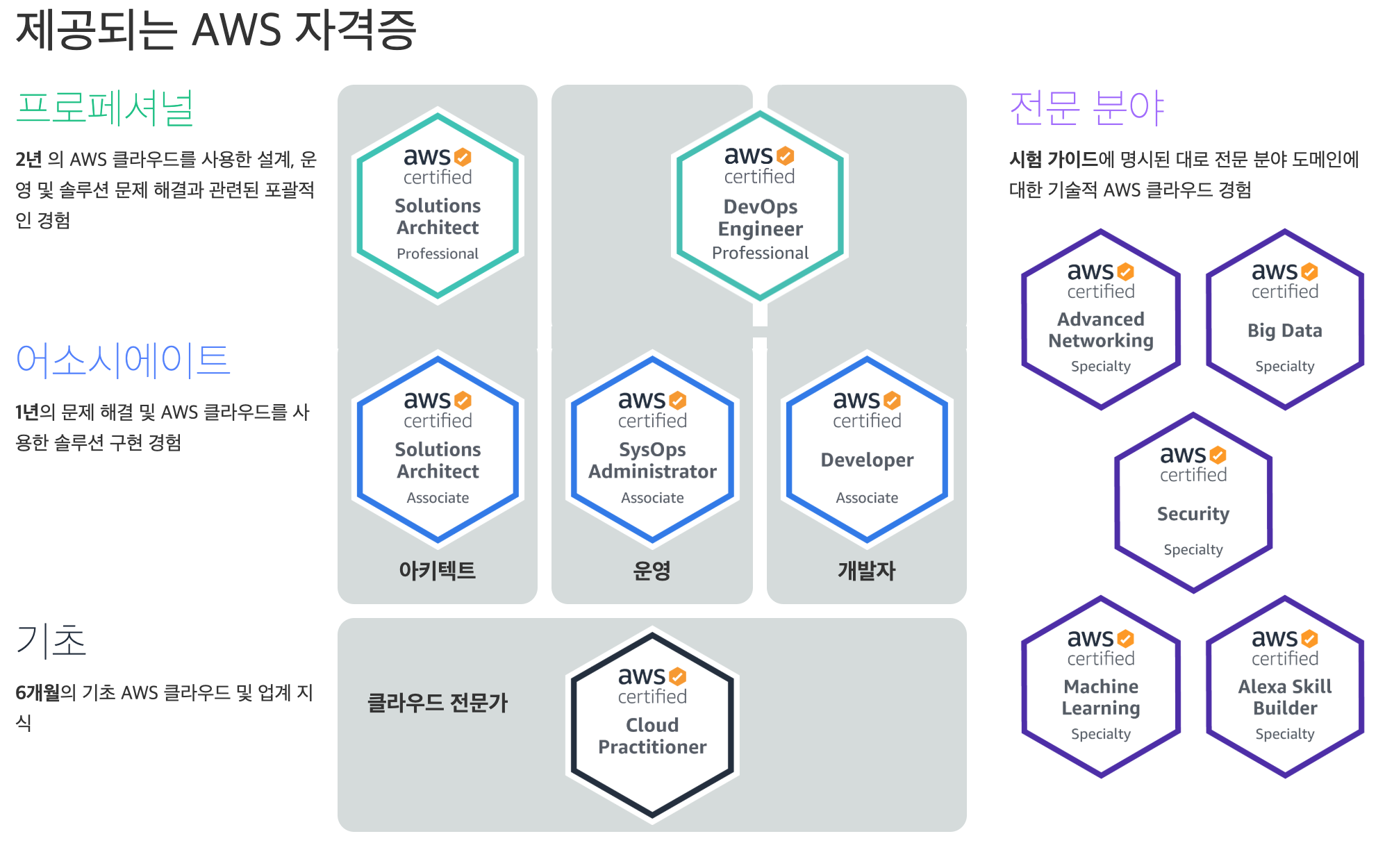 AWS의 자격증은 기초, 아키텍트, 운영, 개발자, 전문분야로 총 5가지 분야로 나뉘어 있고 각각의 세부 항목들이 있다.